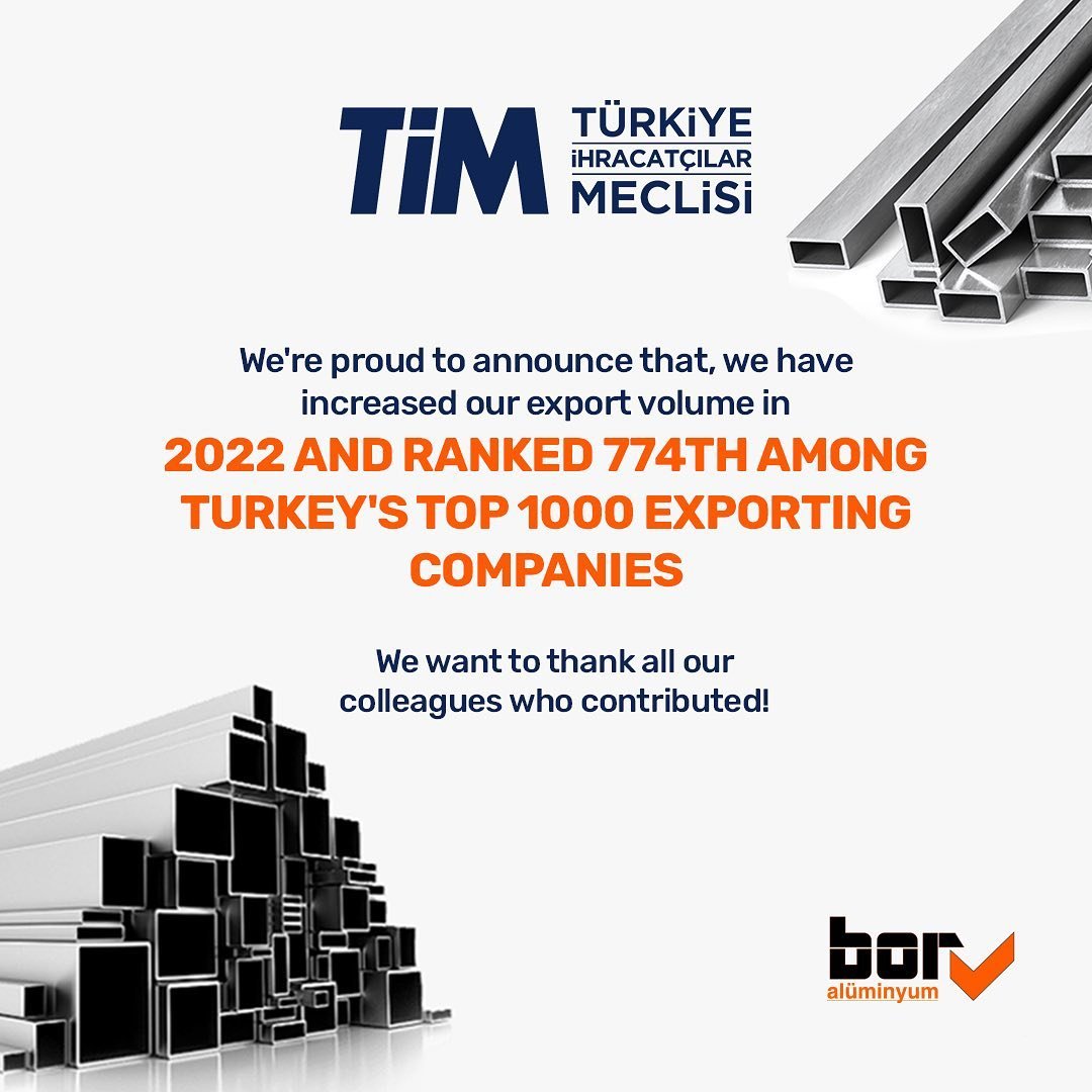 Mit großem Stolz geben wir eine bemerkenswerte Leistung von Bor Alüminyum bekannt. Im Jahr 2022 haben unser Engagement für Exzellenz und unsere unermüdlichen Anstrengungen zu einem erheblichen Anstieg unseres Exportvolumens geführt, was uns die prestigeträchtige 774. Position unter den Top 1000 Exporteuren der Türkei eingebracht hat. Diese Leistung ist eine Hommage an die harte Arbeit,