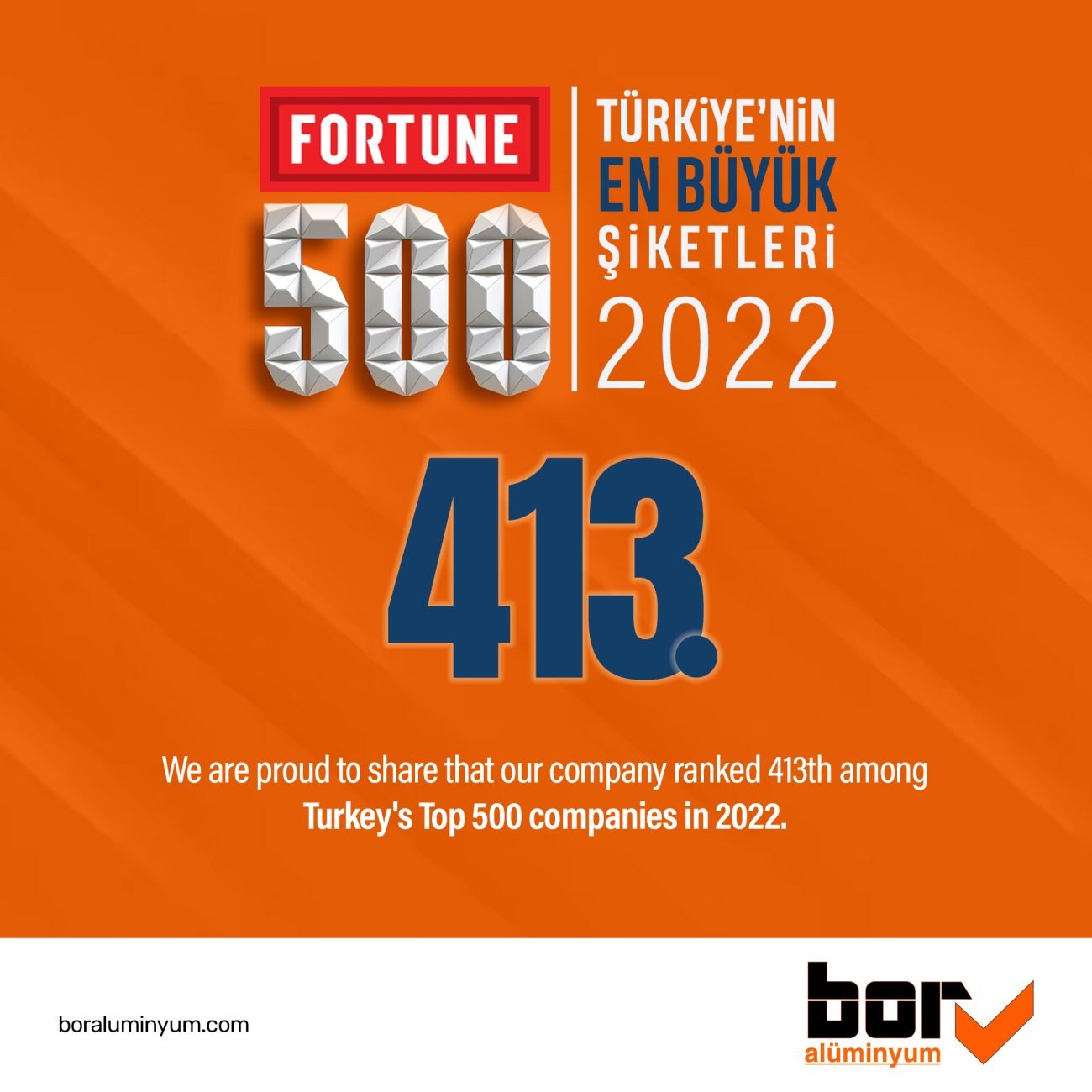 Wir freuen uns, bekannt zu geben, dass Bor Alüminyum im Jahr 2022 einen bedeutenden Meilenstein erreicht hat, indem es den 413. Platz unter den Top 500 Unternehmen der Türkei belegt hat. Diese bemerkenswerte Leistung spiegelt unser Engagement für Exzellenz, unsere Widerstandsfähigkeit angesichts von Herausforderungen und die harte Arbeit unseres engagierten Teams wider. Wachstum reflektieren: Bei